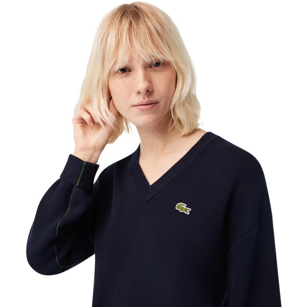 Pullover für Damen Lacoste Eigenschaften weich bequem elastisch Ausschnitt V-Ausschnitt Passform Regular Fit Details elegante Ripp-Details Kontrastsaum Bio-Baumwolle aufgesticktes Lacoste Krokodil-Logo auf der linken Brust Material 100 % Baumwolle
