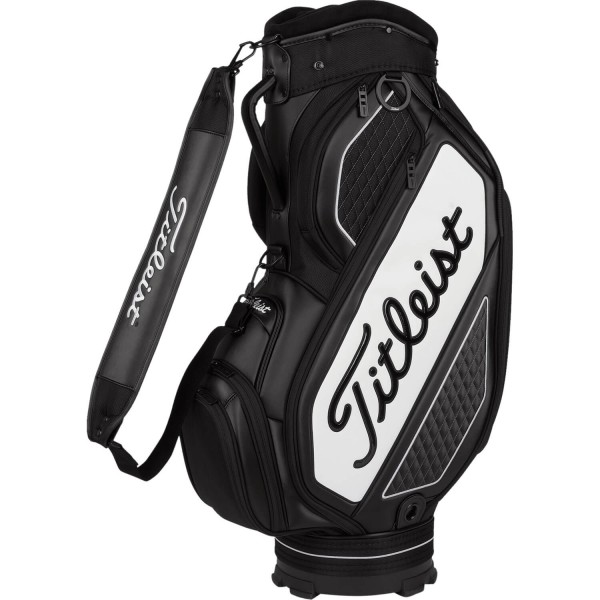 Cartbag Titleist Midsize Staff Jet Black Collection Das Midsize Staff Jet Black Collection Cartbag von Titleist kommt im eleganten schwarzen Tour-Design und überzeugt durch sein hochwertiges Aussehen und durch seine Haptik. Der Titleist-Schriftzug an der Seite des Bags ist ein Blickfang und komplettiert das Design hervorragend. In dem 6-Fach Top sind Ihre Schläger gut aufgehoben. Zur weiteren Austattung des Bags gehören neun geräumige Reißverschlusstaschen sowie ein Magnetfach und ein Fach für Ihren Regenschirm. Mit dem gepolsterten Tragegurt können Sie das Bag komfortabel über den Platz transportieren. Das Bag verfügt zusätzlich über eine Schlägertuch-Halterung am Top. Bag Höhe 89 cm Top Durchmesser 28 cm Gewicht 4,2 kg Wasserdicht nein Anzahl der Fächer 6 Fächer durchgehend teilweise (nur die Querstreben) Kühlfach nein Tragegurt ja Regenschirmhalterung ja Putter-Röhre (extern) nein